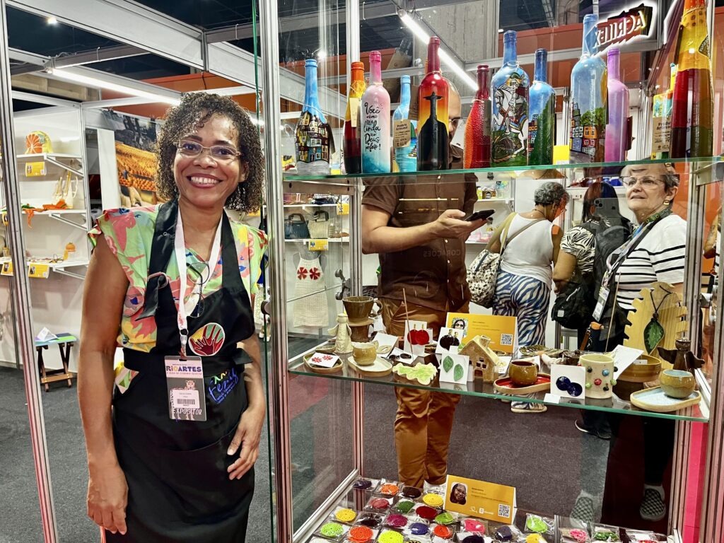 “Os visitantes, que estão passando pelo estande de Nova Iguaçu, estão conhecendo o nosso artesanato e apreciando nossas criações. Assim, mostramos a capacidade de nossos profissionais”, disse Dalva Santos, artesã ceramista que desenvolve um trabalho autoral transformando a argila em peças únicas e cheias de significado. Neste primeiro dia do evento, ela atuou no estande da Fenig junto com as artesãs Jenifer Rebolhedo, especialista na saboaria, e Sonia dos Santos, criadora de bonecos inclusivos.