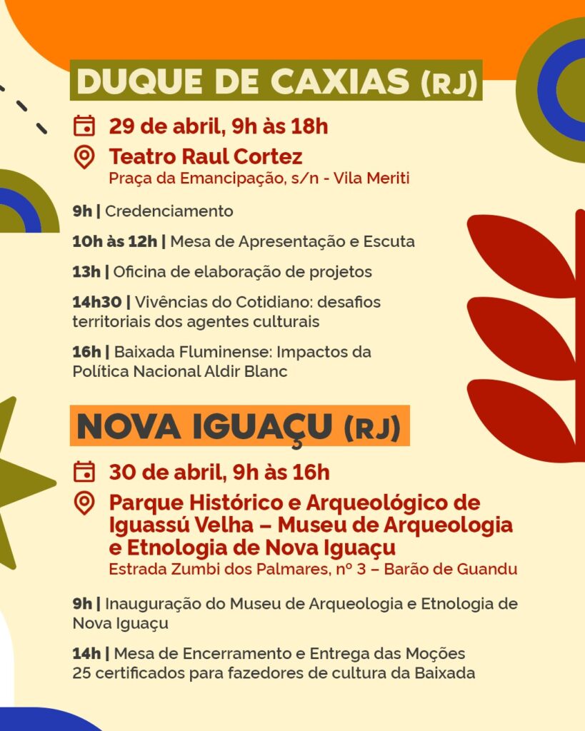 Em Duque de Caxias, as atividades acontecem no Teatro Raul Cortez, reunindo artistas, produtores e representantes culturais para um dia de debates e capacitação. A programação inclui credenciamento, mesa de apresentação e escuta, oficina de elaboração de projetos e discussões sobre os desafios enfrentados pelos agentes culturais no cotidiano dos territórios. Um dos destaques é o debate sobre os impactos da Política Nacional Aldir Blanc na Baixada Fluminense, ampliando o entendimento sobre os investimentos e oportunidades no setor cultural.
